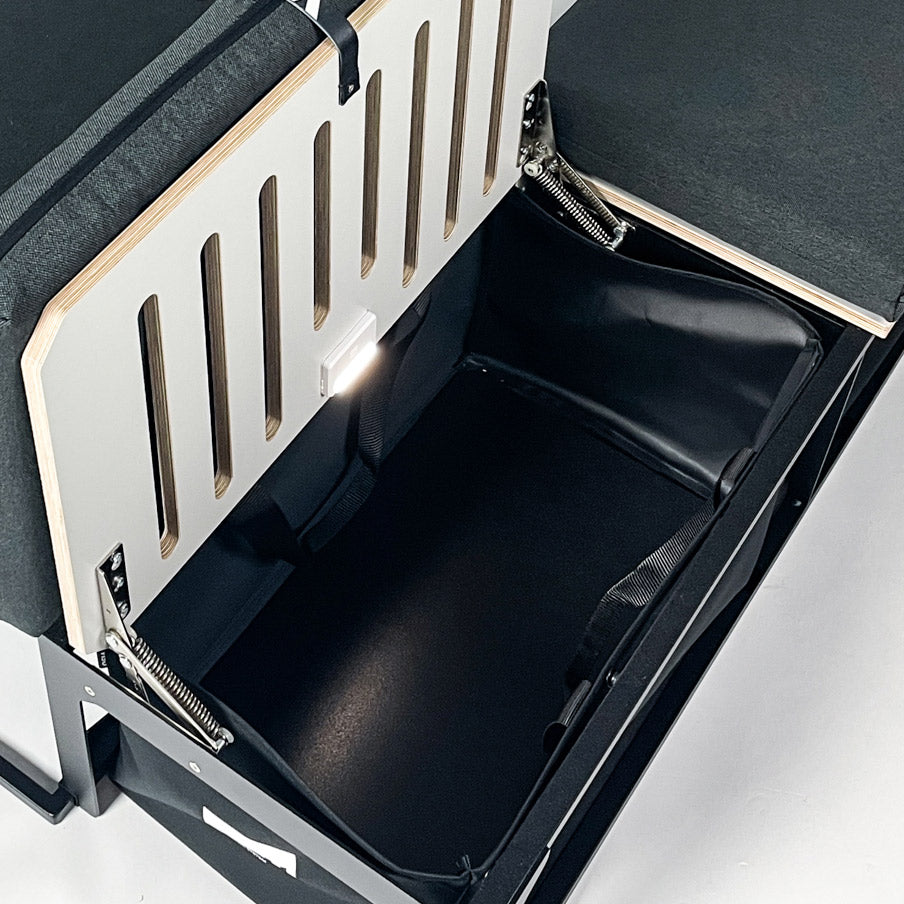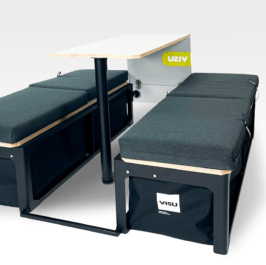 Visu Sitka:3 Lite is a removable sleeping and camping module designed for Volkswagen ID.Buzz. The module offers storage space in practical bags accessible from inside the vehicle, and the large bed can be converted into a spacious seating area with a table for up to 4 people in a matter of seconds. Whole module is in boot of ID.Buzz so with Sitka:3 you can travel in up to 5 people. The module can be installed by one person in 10 minutes without the use of any tools.